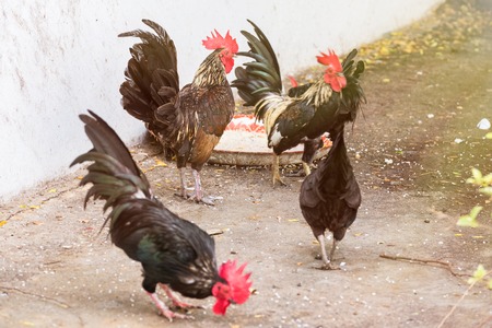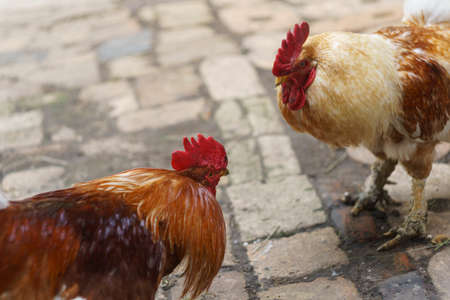 Domestic roosters and hens. Household poultry farming. poultry concept