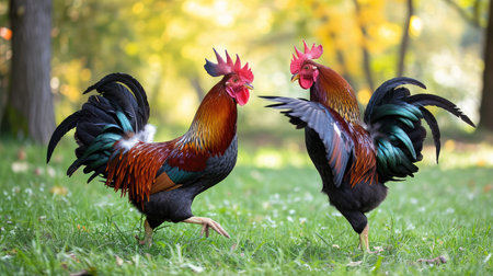 Glorious display of majestic roosters enjoying a picturesque stroll in the countryside