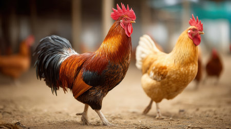 A lively farmyard scene captures a majestic rooster and a hen walking gracefully on the ground, showcasing their colorful plumage and rural charm.