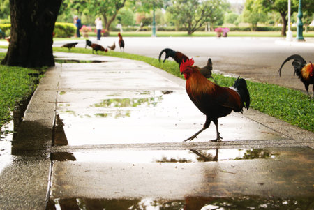 Colorful rooster free in a park on a hot day