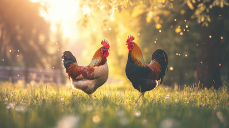 Two vibrant roosters stand gracefully in a sunlit meadow at sunset, showcasing their stunning feathers amidst a serene natural setting.