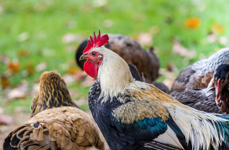 beautiful chickens and roosters outdoors in the yard