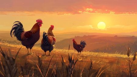 Group of roosters enjoying the morning sun on an eco-friendly farm. The vivid sunrise highlights their vibrant feathers, creating a serene and natural farm setting.