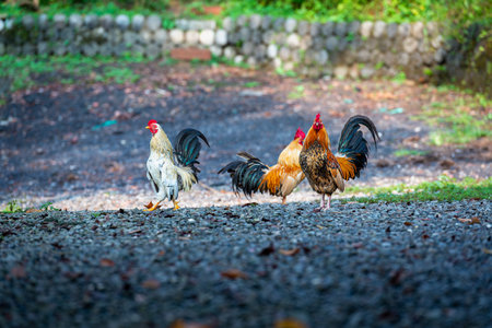 Some energetic roosters roam freely in the mountains, surrounded by lush greenery and stone walls. The chickens display their colorful feathers.