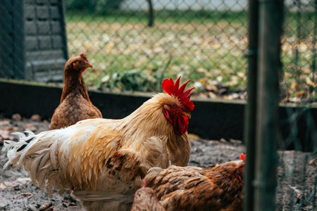 chickens and rooster on traditional free range poultry farm in countryside