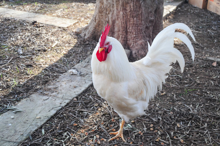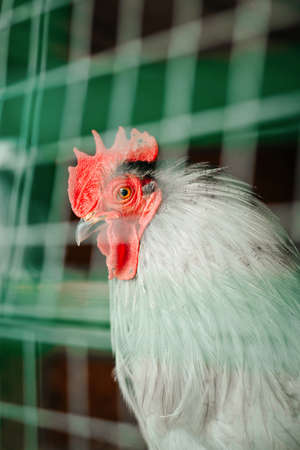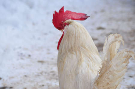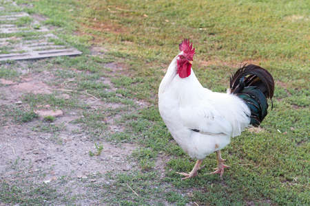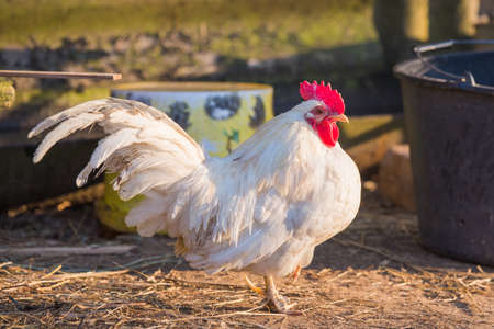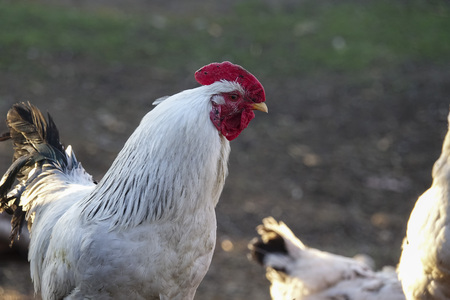 White rooster, organic chicken farm. Traditional poultry.