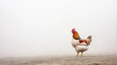 A solitary rooster stands gracefully in a foggy landscape, showcasing its vibrant plumage against a soft, serene backdrop. The early morning light creates a tranquil atmosphere, perfect for capturing the essence of rural life.