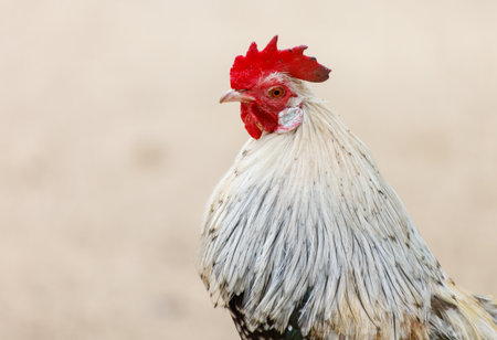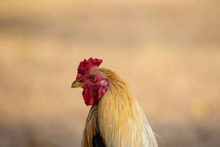 Farm living bird rooster looking around, head portrait, beak and crest