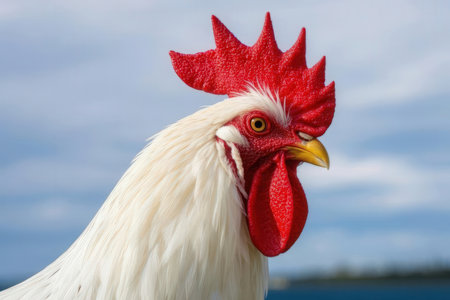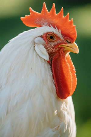 A close up of a proud white rooster with a striking red comb and wattle, against a softly blurred background Its vibrant colors stand out vividly