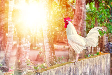 Morning white rooster on a fence amid the sun shining through the garden trees. Morning on a rural farm