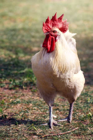 White fat rooster on backyard. White cock with red crest and beard. Chicken breed with white feather. Red comb and wattle of rooster. Fat fluffy chicken male. Domestic bird on farm yard