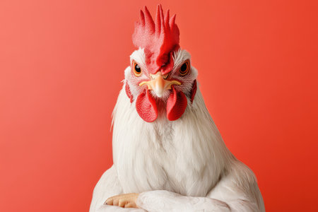 Illustrated rooster standing tall with arms crossed, conveying boldness, humor, and cartoon personality against a vibrant background.