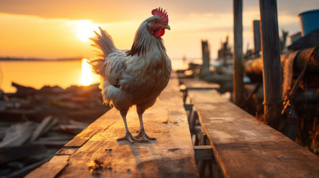 a rooster gracefully strolls along a wooden dock, bathed in the warm glow of a sunset. this captivating image captures the essence of ethical concerns and pop-culture influences. the rooster's light brown and white feathers create a stunning contrast against the backdrop. with dignified poses, this nonrepresentational photograph, shot on fujifilm velvia, showcases the sheer beauty of nature. ai generated