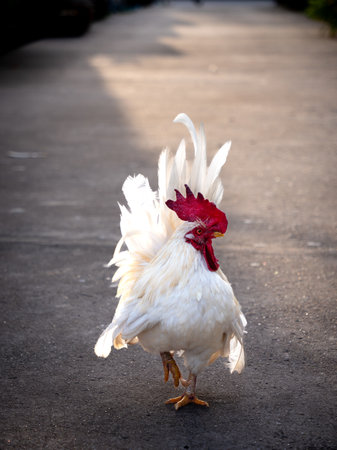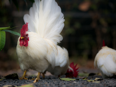 beautiful, young white color feather rooster walks on the farm.