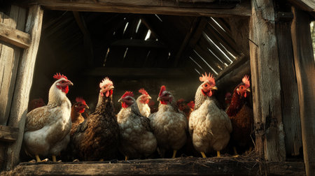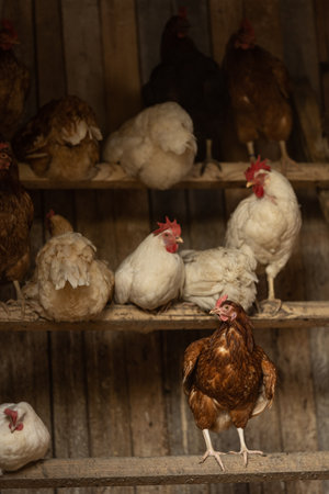 Chickens roosting in a cozy coop at dusk, portraying the end of a productive day on the farm.