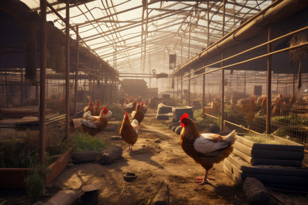 The spacious and well - organized environment of a modern chicken farm with a close - up shot of a chicken house. Generative AI