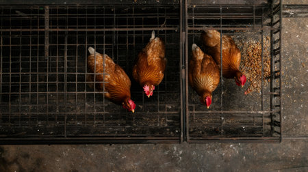 Four brown hens are pecking inside separate sections of a metal cage on a traditional farm, providing a glimpse into poultry farming practices
