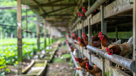 Rows of laying hens eating in a chicken farm, industrial poultry farming concept