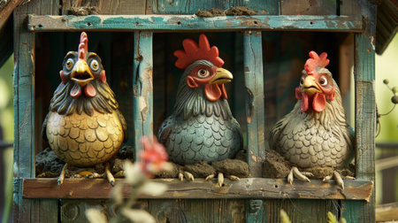 chickens perched on a wooden fence in the backyard, created with generative ai