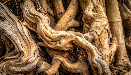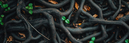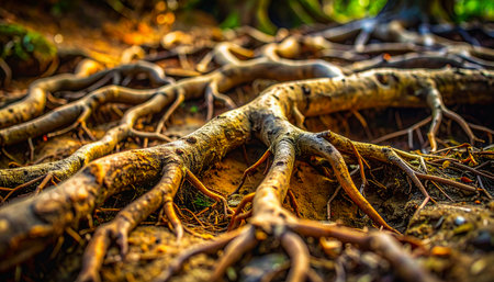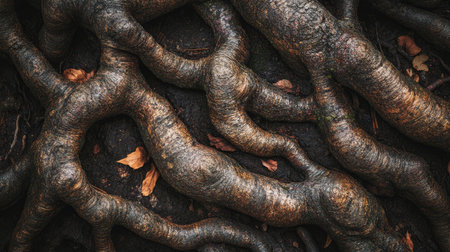 Close-up of tree roots intertwining on the forest floor, showcasing their intricate patterns and textures.