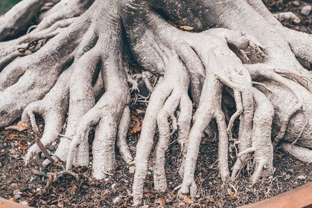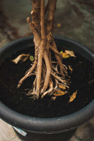 roots of a tropical plant called bonsai in a large flower pot in a botanical garden