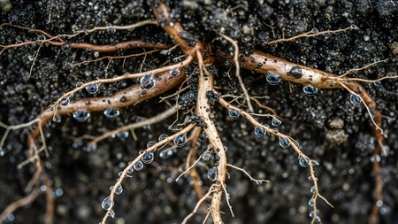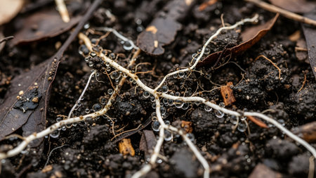Plant roots with water droplets. Network of fine white roots emerging from dark soil, showing moisture and organic debris