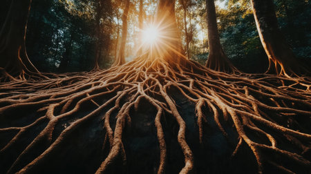Majestic Tree Roots Sunlight Forest Nature Background Image wood view life warm dark deep wild brown