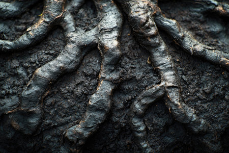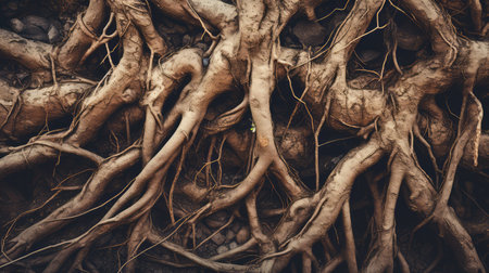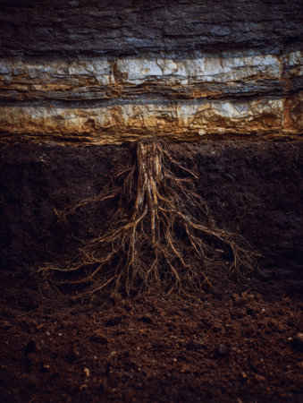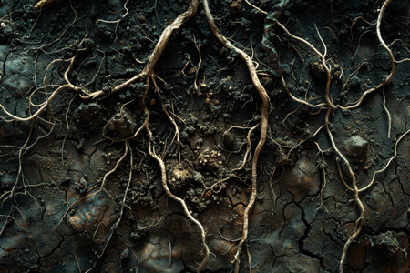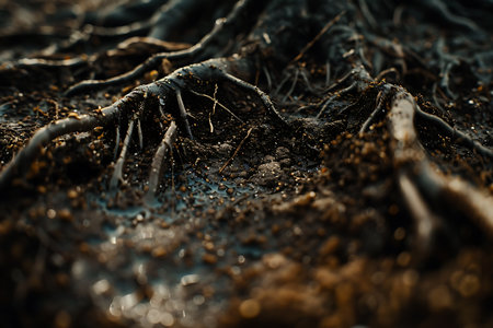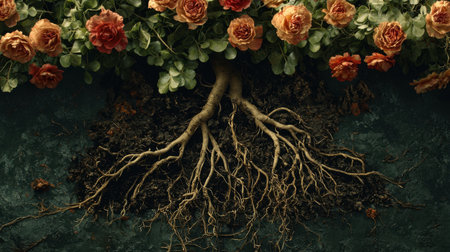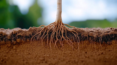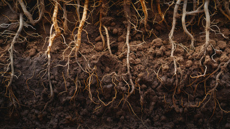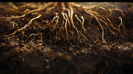 Close-up of plant roots thriving in nutrient-rich, fertile soil. Witness the beauty and vitality of nature's underground marvels