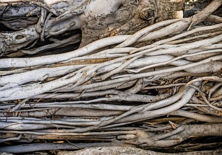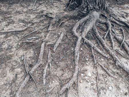 The spreading root system of the old tree on the ground. The variety of shapes in wild nature. Perfect background for the various kinds of collages, illustrations and digital media.