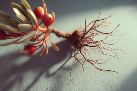 Close-up of artificial plant with exposed roots and red berries against blue background.