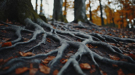Close-up of tree roots stretching across soil in a tranquil autumn forest. Brightly colored leaves surround the roots, highlighting nature's beauty.