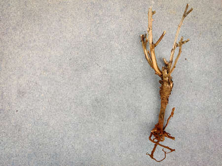 Copy space of Stem with roots of a small plant. Isolated on grey background.save trees concept