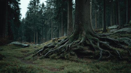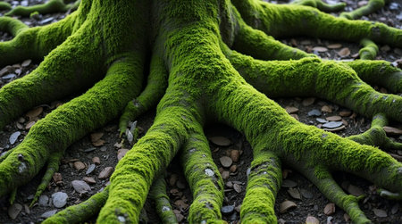 Ancient moss-covered tree roots spread across forest floor, a symbol of nature's enduring strength.