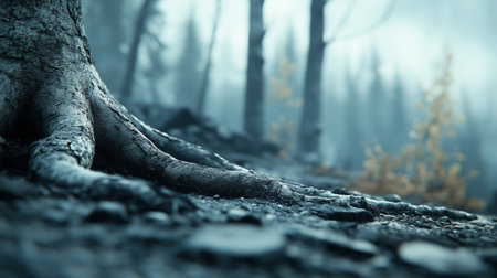 close up view of tree root in misty forest, showcasing intricate textures and details of bark and soil, evoking sense of tranquility and connection to nature.