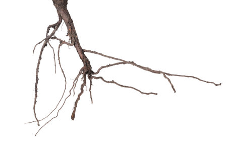 Isolated plant roots on green background. Selective focus points