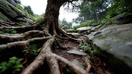 This captivating image showcases a resilient tree with roots stretching through rocky stones on a tranquil pathway. Nature's beauty and strength shine.