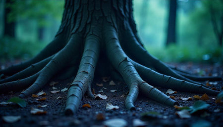 dramatic close-up shot of tree roots in forest