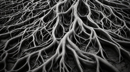 interlocking black and white tree roots illustration depth captivating, beauty photography, texture organic interlocking black and white tree roots