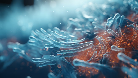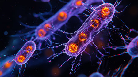 a detailed microscopic view of numerous bacteria cells with orange and red highlights in a blue environment