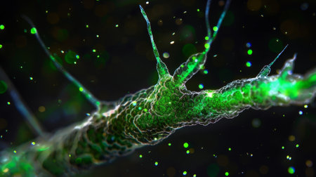 Microscopic view shows botulinum therapys impact on nerve fibers and muscle interactions, highlighting the therapeutic application for various conditions.