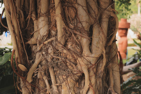 roots of a tropical plant called bonsai in a large flower pot in a botanical garden