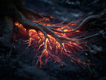 Captivating close-up of tree roots radiating vibrant orange light, symbolizing energy and life. Perfect for themes of nature, beauty, and innovation.
