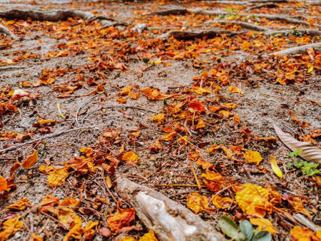 Fallen Flamboyant, The Flame Tree or Royal Poinciana, flowers on the ground ith it roots. Selective focus with blurred background.