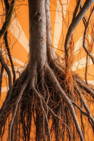 The root system of the lemon tree. Roots on a bright orange background.