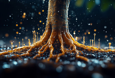Golden tree roots. Surreal close-up of vibrant golden-orange roots emerging from dark soil, with glowing droplets creating a fantastical atmosphere.