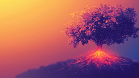 A radiant tree stands prominently against a calming gradient background, its glowing roots visible as they extend deep into the earth, representing growth and interconnectedness.