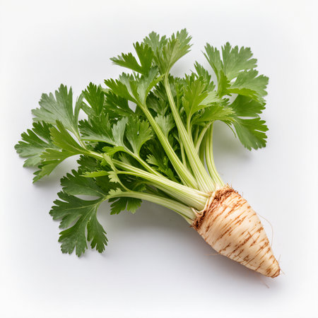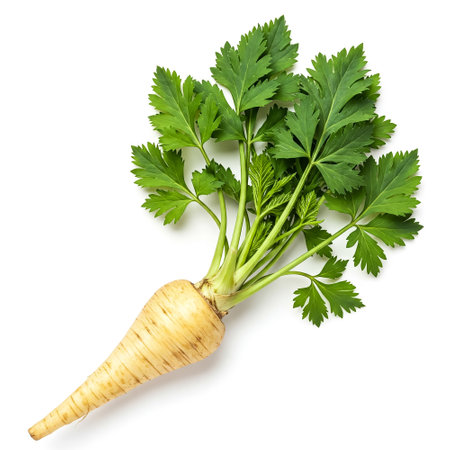 A fresh parsnip with its bright green foliage showcases its natural beauty. Perfect for adding flavor to soups or salads, this root vegetable is essential for nutritious cooking.