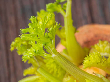 Root vegetable parsley with green leaves on a wooden background, farm vegetables