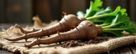 Parsley and selera roots with tops and black radish close-up on a brown background, top view, healthy autumn seasonal roots banner, copy space