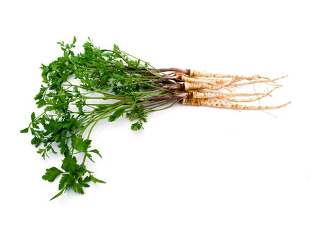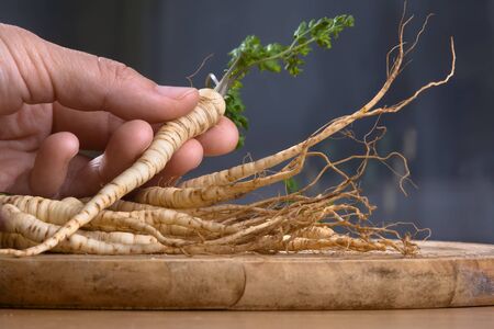 Medicinal herbs and roots. We prepare parsley root in the spring for future use. Parsley root with herbs on a wooden table.